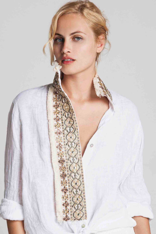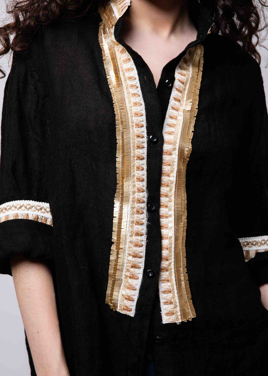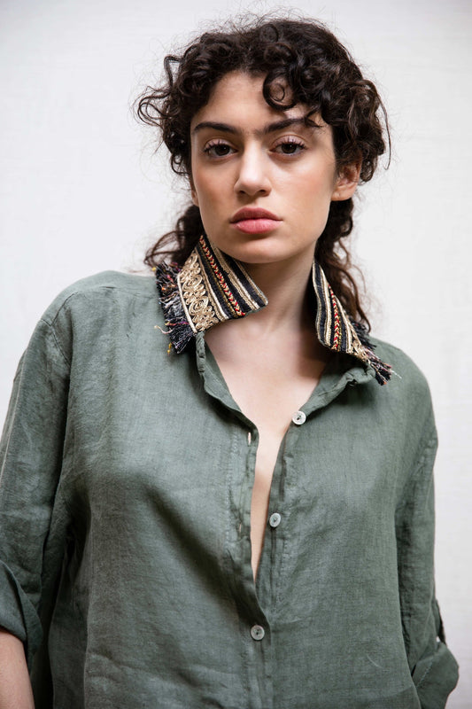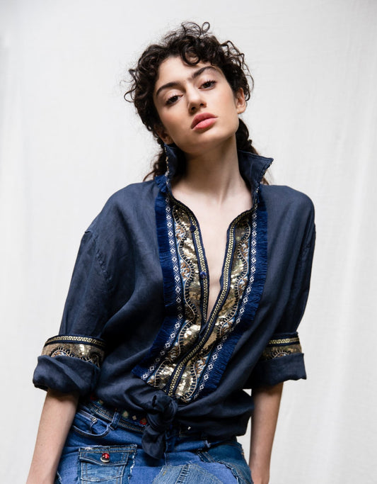 Classic vintage military shirt with denim details and unique coin embroidery bands