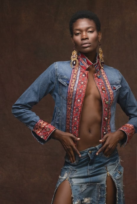 This jacket is a masterpiece of deconstructed luxury, featuring high-contrast artisanal bands that frame the body with vibrant color and light.