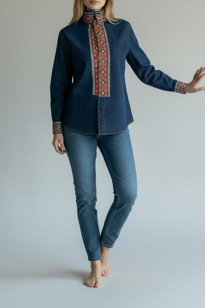 Delicate embroidered accents add a unique artistic touch, elevating the classic denim shirt with subtle elegance. Versatile and easy to style, it pairs effortlessly with trousers, skirts, or denim pieces for a modern, chic outfit that transitions seamlessly from day to night.