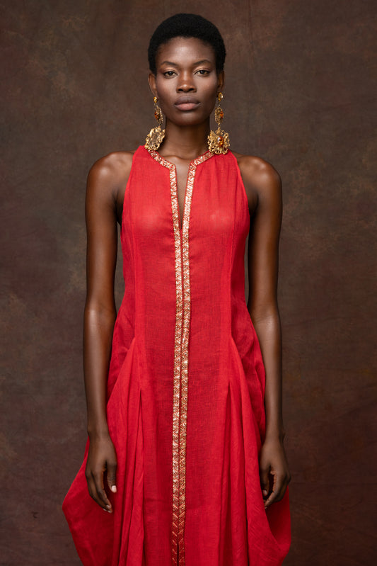 Red Linen Dress With Metallic Trim