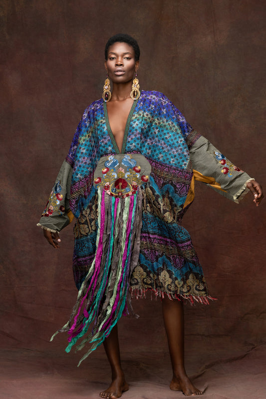 Unique Silk Caftan With Multi-Colored Ribbons